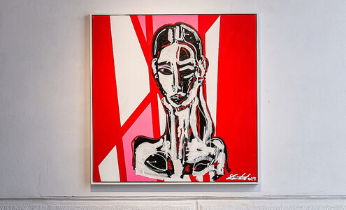 In weiteren Arbeiten zeigen sich andere Stilelemente: Geometrische Formen, gerade Linien und ein flächiger Farbauftrag bereiten die Bühne für seine mit expressivem Gestus gemalten Figuren – oftmals inspiriert von Menschen, die ihm besonders am Herzen liegen. So ist auf zwei der Arbeiten seine Freundin Paula Partl zu sehen. Leon Löwentraut: „Ihr Wesen und ihre Aura inspirieren mich.“